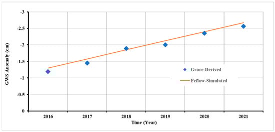 The temporal pattern of GRACE-inferred GWS has been incorporated as an additional regularization dataset for verification of the developed model. The FEFLOW software allows the control of the simulation time via an integration scheme [41], while the simulation results can be depicted according to the recorded output time steps. An automatic time control scheme using the Adams-Bashforth/backward trapezoid (AB/TR) predictor-corrector scheme was adopted [30]. Using the “Period Budget” utility, the developed model can capture the inflows and outflows quantity during a simulation period, and thereby the corresponding storage loss/gain is estimated. The simulated annual mean storage anomaly from 2016 to 2021 was obtained as 16.27 Mm3 (about 0.276 cm EWH), which is close to the GRACE-derived GWS anomaly (0.26 cm/year), as shown in Figure 7.