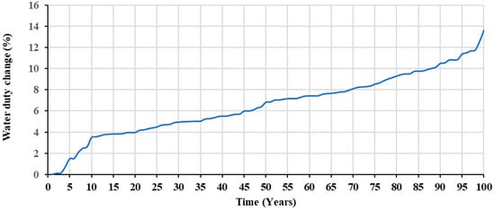 Crop consumptive use is often referenced to the evapotranspiration (ET) that can be estimated using different theoretical approaches (e.g., the Blaney–Criddle formula). Global warming causes an increase in crop water requirements that differ regionally. Regional climate models (RCMs) are therefore employed to project climate conditions on a regional scale and thus provide accurate estimates over general circulation models (GCMs) [7]. The outputs of “MPI-ESM-LR/RCA4, GCM/RCM” ensemble simulations, provided through the CORDEX project (CORDEX website at https://esg-dn1.nsc.liu.se/projects/esgf-liu/; accessed on 1 January 2024) were used to project the increase in potential evapotranspiration (PET) over the wells field [69]. Figure 8 shows the projected percentage change in PET during the upcoming 100 years. The average annual increase in PET is 0.0058 mm, which implies an annual increase in water duty by 0.019 m3/acre/day (≈0.047 m3/hectare/day).