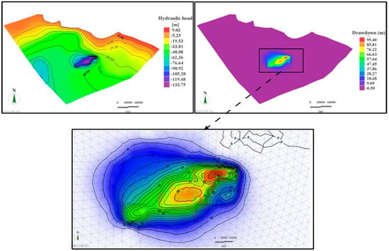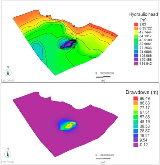 Simulated hydraulic heads (Up) and drawdowns (Down) for the recommended pumping scheme (1.3 Mm3/day) after 100 years.