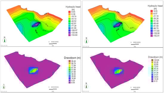 Simulated hydraulic heads (Left) and drawdowns (Right) after 100 years of applying the recommended development regime under the combined effects of climate change.