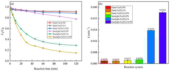 Degradation efficiency (a) and pseudo-first-order rate constant (b) of SMX in different systems. Conditions: [SMX] = 1 mg/L, [Fe(II)] = 0.1 mM, [Cit] = 0.6 mM, [PS] = 1 mM, reaction time of 120 min (a) and 30 min (b).