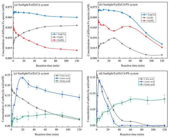 Changes in the concentration of different Fe species (a,b) and carboxylic acids (c,d) in the sunlight/Fe(II)/Cit system and the sunlight/Fe(II)/Cit/PS system. Conditions: [SMX] = 1 mg/L, [Fe(II)] = 0.1 mM, [Cit] = 0.6 mM, [PS] = 1 mM.