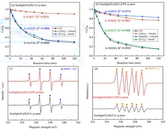 Effect of radical scavengers on SMX degradation in the sunlight/Fe(II)/Cit system (a) and the sunlight/Fe(II)/Cit/PS system (b); EPR spectra of DMPO−·OH (c) and DMPO−O2·− (d) in the sunlight/Fe(II)/Cit system and the sunlight/Fe(II)/Cit/PS system. Conditions: [SMX] = 1 mg/L, [Fe(II)] = 0.1 mM, [Cit] = 0.6 mM, [PS] = 1 mM.
