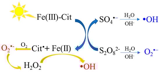 Figure 4 displays the production mechanism of reactive radicals in the sunlight/Fe(II)/Cit/PS system. Based on the previous report, the main species of Fe(III)–Cit complex at pH 7 is [Fe3O(Cit)3H3]2−, which has a higher photolysis rate of 1.32 × 10−3 s−1 [18]. Under the irradiation of sunlight, Fe(III)–Cit complexes undergo an LMCT process and produce Fe(II) and free citrate radicals (Equation (6)). Then, the free citrate radicals react with O2, leading to the formation of O2·−/HO2· (Equations (7) and (8)). The dismutation of HO2· generates H2O2 (Equation (9)), which reacts with Fe(II) to produce ·OH via the Fenton process (Equation (10)) [25,38]. The regenerated Fe(II) can also activate PS to generate SO4·−and ·OH (Equations (1), (11) and (12)). Moreover, PS can also directly generate O2·− in an alkaline environment (Equation (13)) [39].