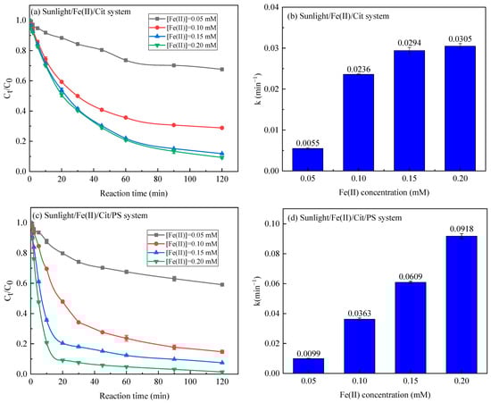 Degradation efficiency and reaction kinetic rate of SMX in the sunlight/Fe(II)/Cit system (a,b) and the sunlight/Fe(II)/Cit/PS system (c,d) with varying Fe(II) concentration. Conditions: [SMX] = 1 mg/L, [Fe(II)]/[Cit] = 1:6, [PS] = 1 mM.