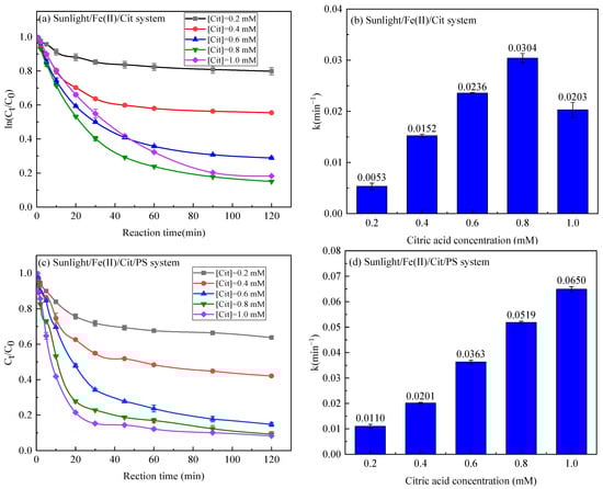 Degradation efficiency and reaction kinetic rate of SMX in the sunlight/Fe(II)/Cit system (a,b) and the sunlight/Fe(II)/Cit/PS system (c,d) with varying citric acid concentration. Conditions: [SMX] = 1 mg/L, [Fe(II)] = 0.1 mM, [PS] = 1 mM.