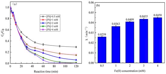 Figure 7 depicts the removal of SMX and degradation rate constant of SMX in the sunlight/Fe(II)/Cit/PS system with varying PS concentration at 0.1 mM Fe(II) and 0.6 mM citric acid. The degradation of SMX increased with increasing of PS concentration, with the degradation rate constant of SMX of 0.0259–0.0450 min−1 at 0.5–4 mM PS. The activation of PS can produce reactive species SO4·− and ·OH; therefore, it is expected that the elevated PS concentration would show a positive effect on SMX degradation [42]. However, the SMX degradation rate constant only increased a little when PS concentration increased from 1 mM to 4 mM, this suggested that Fe(II) is an important limitation factor with overdosage of PS. Further, excessive PS dosage of PS will consume reactive species, which to some extent results in the minor improvement in the SMX degradation rate.