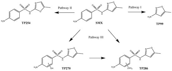 Correspondingly, possible degradation pathways were proposed for the degradation of SMX by the sunlight/Fe(II)/Cit/PS system (Figure 8). In degradation pathway I, the cleavage of the S–N bond of SMX via the hydrolysis of the sulfonamide bond generated the degradation product TP99 (3-amino-5-methylisoxazole). TP99 has been reported to be generated in various treatment technologies of SMX, for instance, photodegradation [27], catalytic ozonation [43], chlorination [44], and peroxymonosulfate activation by immobilized CoFe2O4 network [45]. In degradation pathway II, an SMX isomer denoted TP254 was formed via isoxazole ring rearrangement [46]. TP254 has the same m/z value and fragmentation ions but a different elution time as SMX. The SMX isomer was reported in the direct photolysis of SMX [46,47]. In degradation pathway III, the aromatic ring of SMX was attacked by reactive species such as ·OH and formed two hydroxylated products, TP270 and TP286. The characteristic fragment ion of TP270 (m/z 172.0071) and TP 286 (m/z 188.0019) were 16 Da and 32 Da higher than the characteristic fragment ion of SMX (m/z 156.0120), respectively (Figure S1, Supplementary Materials). This indicates that the hydroxyl replacement occurred on C of the aromatic ring. TP270 was observed in the catalytic ozonation of SMX [43], photocatalytic degradation of SMX [48], and PMS activation by 2D ZIF-L arrays supported on zinc foam degradation of SMX [49]. Wang et al. [50] observed both TP270 and TP286 in the degradation of SMX by PMS activated by iron and sulfur co-doped graphite carbon nitride.