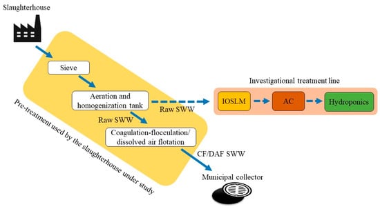 Schematic diagram of the slaughterhouse wastewater pretreatment line in the slaughterhouse and the treatment line under investigation.