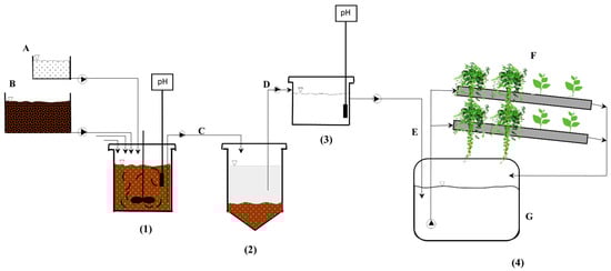 Schematic diagram containing operations and processes of treatment used in this work, namely: (1) IOSLM process, (2) sedimentation process, (3) AC process, and (4) hydroponic system. A—hydrated lime tank, B—SWW tank, C—IOSLM SWW, D—supernatant, E—hydroponic nutrient solution, F—aromatic plant grow bed, G—hydroponic nutrient solution tank.