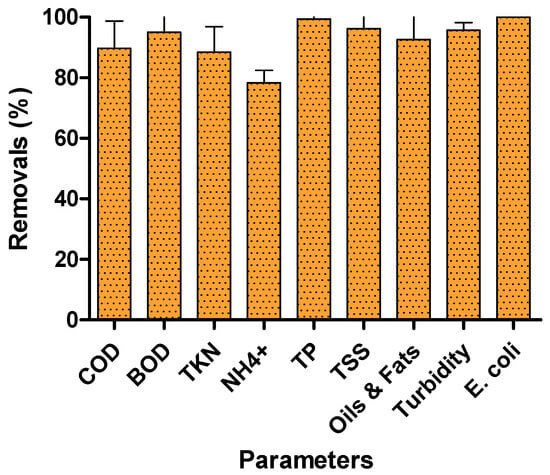 The performance of the IOSLM/AC sequence was evaluated using raw SWW whose characteristics are shown in Table 1. Figure 3 shows the removal efficiencies obtained for the various parameters analyzed. After the IOSLM/AC sequence, the effluent had a pH of 7.7 ± 0.1. High removal efficiencies of COD (89.7 ± 9.0%), BOD (95.0 ± 9.0%), TKN (88.4 ± 8.4%), NH4+ (78.3 ± 4.2%), TP (99.4 ± 16.6%), TSS (96.2 ± 19.0%), oils and fats (92.6 ± 12.4%), turbidity (95.7 ± 2.5%), and E. coli (100%) were achieved. These removals corresponded to COD concentrations of 411 ± 24 mg L−1, BOD of 100 ± 0 mg L−1, TKN of 28 ± 1 mg N L−1, NH4+ of 25 ± 1 mg N L−1, TP of 3.0 ± 0.5 mg L−1, TSS of 70 ± 12 mg L−1, oils and fats of 44 ± 3 mg L−1, turbidity of 69 ± 1 NTU, and the absence of E. coli. As expected, nitrite and nitrate concentrations remained below detectable limits. So, all parameters meet the limits for discharge to municipal collectors.
