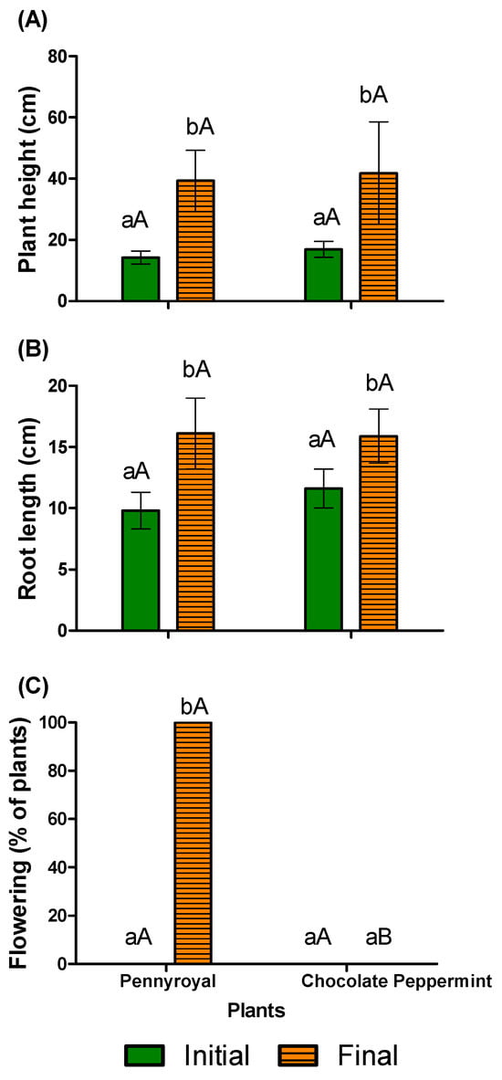 Initial and final morphological characteristics of Pennyroyal and Chocolate Peppermint plants used in hydroponic system in terms of: (A) plant height, (B) root length, and (C) flowering. Bars represent one standard deviation of the mean. Note: different lowercase letters in the same type of plant represent a significant difference (p < 0.05); different capital letters for the same temporal condition indicate a significant difference (p < 0.05).