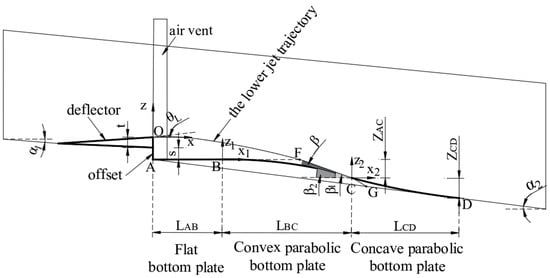 The impact angle of the jet flow behind offset is the most critical factor causing cavity backflow. When the impact angle decreases to a certain extent, the accumulated water in the cavity disappears []. Based on this idea, as shown in Figure 1, this study transforms the local bottom slope behind the offset into a body structure composed of the flat bottom plate LAB, the convex parabolic bottom plate LBC, and the concave parabolic bottom plate LCD. The lower edge OC of the jet flow impacts on the connection point C of the convex bottom plate and the concave parabolic bottom plate, where the local slope is the largest. By designing the parabolic curves reasonably, the lower jet trajectory fits to the bottom plate, effectively reducing the jet impact angle, eliminating cavity backflow, and ensuring sufficient aeration flow.