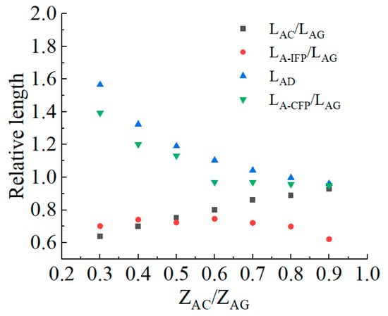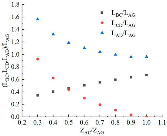 List the parameters of each part of the bottom plate obtained above in Table 1, and plot the relationship between ZAC/ZAG and the relative length LBC/LAG, the relative length LCD/LAG, and the relative total length LAD/LAG, as shown in Figure 2. As the ZAC/ZAG value increases, the relative length LBC/LAG gradually increases, the relative length LCD/LAG significantly decreases, and the relative total length LAD/LAG gradually decreases. This indicates that the larger the ZAC/ZAG value, the closer point C is to point G, the steeper the slope of the jet landing point C, and the less likely the cavity is to backflow.