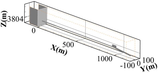 The numerical simulation calculation area includes the upstream reservoir, pressure tunnel section, gate chamber section, and non-pressure section, with a total length of about 1260 m, as shown in Figure 3. The RNG k-ε turbulence model is suitable for complex flows such as strongly turbulent water flow, jet collision, and separated flow. It considers the anisotropy of turbulence and corrects turbulence viscosity, which can repair complex turbulence simulations to a certain extent, and especially for situations with large flow amplitudes, the RNG k-ε model has more advantages, so this article adopts the anisotropic RNG k-ε turbulence model []. A coupled solution was obtained using the PISO algorithm, using unsteady flow to approximate constant flow for iterative calculation.