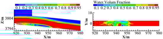 In order to accurately observe the shape of the cavity, the aerator section is the focus of simulation calculations. Due to its clear interface tracking, conservation, interface reconstruction techniques, wide applicability, and ease of implementation, the VOF method is particularly suitable for capturing air/water interfaces in simulations [,]. In this paper, the VOF [,,] method is used to calculate the water/air interface. The basic principle of the VOF method is to define a fluid volume function F in each grid unit in the computational domain. When F = 1, it means that the grid unit is completely filled with a certain fluid phase. When F = 0, it indicates that there is no fluid phase in the grid cell. When 0 < F < 1, it indicates that the grid cell is filled with at least two fluid phases, and the cell is referred to as the interface between the fluids. The value of F can be obtained by solving Equation (11), which needs to satisfy the following transport equation: