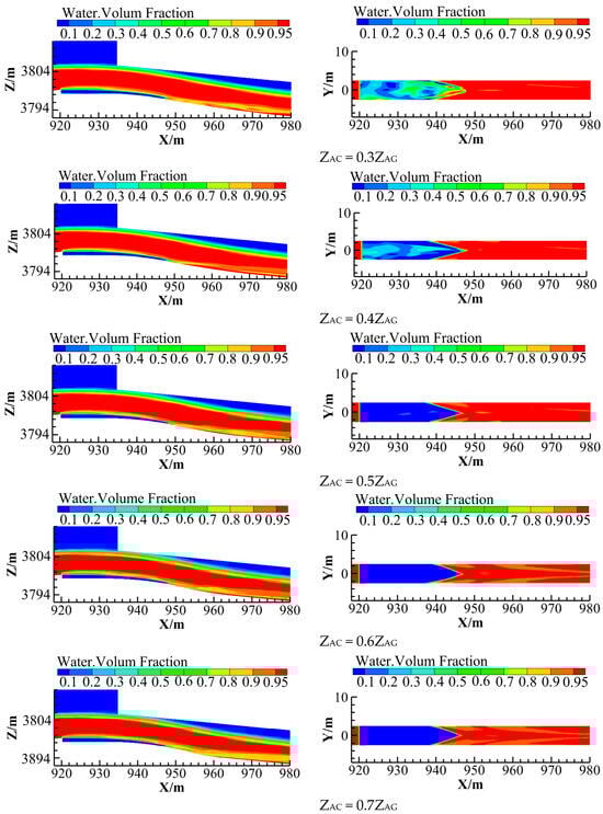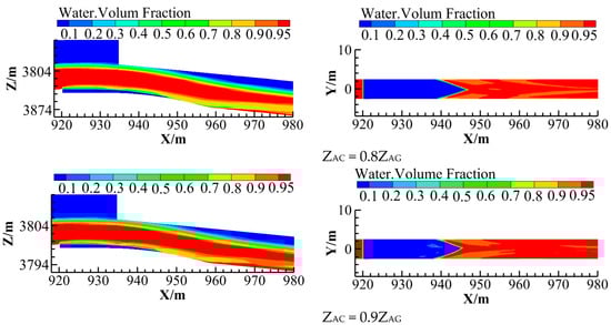 The numerical simulation first calculates “the small deflector + the offset“ combination aerator, and the calculated cavity shape is shown in Figure 5. Then, seven reasonable shapes designed in Section 4.1 and Section 4.2 are simulated and calculated. The calculated cavity shape of the longitudinal profile of the discharge channel bottom plate and the bottom plate are shown in Figure 6. (1) Due to the dual effects of small bottom slope and gravity, traditional aerators have severe cavity backflow and poor flow state. The seven reasonable types of aerators calculated using the design method in this article have stable cavities and better flow state than traditional aerating facilities. When ZAC/ZAG ≤ 0.5, there is a small amount of water accumulation in the cavity, and when ZAC/ZAG ≥ 0.5, there is almost no water accumulation in the cavity. (2) As the ZAC/ZAG value increases, the maximum net cavity length shows a trend of first increasing and then gradually decreasing. (3) The maximum net cavity length on the bottom plate of the discharge channel shows a shape of “convexity on the middle and concavity on both sides”, which is mainly due to the fact that in the two-dimensional continuous aeration facility the middle jet flow has a high velocity, while the jet flow on both sides has a low velocity.