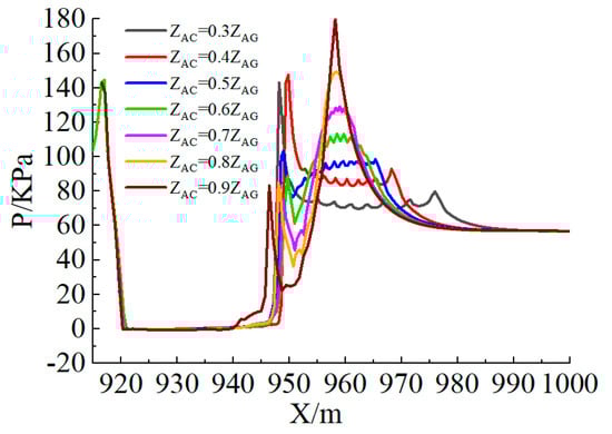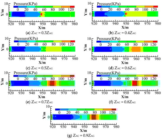 Time-average pressure distribution of the local bottom plates is shown in Figure 7 and the calculated value of time-average pressure at the centerline of the bottom plate is shown in Figure 8. Under different ZAC/ZAG values, we plot the relationship between relative convex parabolic segment LAC/LAG and relative impact force peak position LA-IFP/LAG, and the relationship between relative total length LAD/LAG and relative centrifugal force peak position LA-CFP/LAG is shown in Figure 9. (1) The pressure change in the platform bottom plate is not significant, with a range of −2 KPa < p < 0 KPa. When ZAC/ZAG = 0.6, the negative pressure is minimum, and when ZAC/ZAG = 0.9, the negative pressure is maximum. (2) The pressure distribution in the convex concave parabolic section shows a “bimodal” pattern. The maximum pressure value generated when the jet flow impacts the convex parabolic bottom plate is the impact force peak, and the maximum pressure value generated when the centrifugal force acts on the concave parabolic bottom plate is the centrifugal force peak. At the same ZAC/ZAG value, the pressure significantly increases to the impact force peak, gradually decreases and fluctuates within a certain range, then gradually increases to the centrifugal force peak and significantly decreases and tends to stabilize. (3) As the ZAC/ZAG value increases, the impact force peak first increases and then decreases, and the maximum net cavity length also increases first and then decreases, while the centrifugal force peak gradually decreases. Possible causes of this phenomenon are as follows: One reason is that as the ZAC/ZAG value increases, the concave parabolic section gradually decreases and rapid stream, resulting in the flow unable to discharge smoothly, causing the upstream jet flow to impact the bottom plate in advance, and the impact force peak and the centrifugal force peak to gradually coincide. Secondly, although the take-off angle of the lower jet trajectory is accurately calculated in the process of body shape design, the Froude number Fr calculation uses the average velocity in front of the aerator, resulting in a difference between the designed point C and the impact force peak position. Overall, the position of the impact force peak fluctuates back and forth within a certain range of the point C.