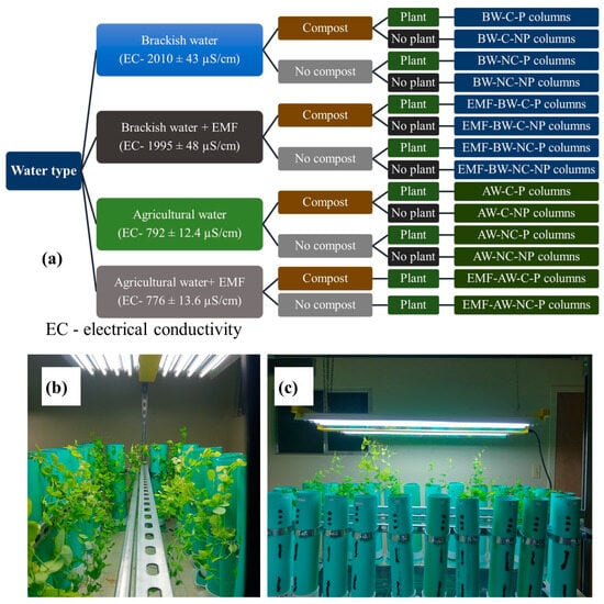 Fourteen combinations of irrigation water and soil compost treatments were conducted for two months to assess the impact on soil properties and plant growth parameters under greenhouse conditions (Figure 1). This study involved 42 soil columns (3 replicates for each condition) irrigated with 4 different types of water (brackish water and agricultural water with and without EMF treatment), with and without plants, as depicted in Figure 1. The environment for the plant growth was simulated under greenhouse conditions with the utilization of agro-lamps (model: AgroMax F54T5HO and GROW SPECTRUM EM-H20, HTG supply, Callery, PA, USA). The greenhouse study was closely monitored, and the room temperature was maintained at 18 °C to promote successful seed germination.