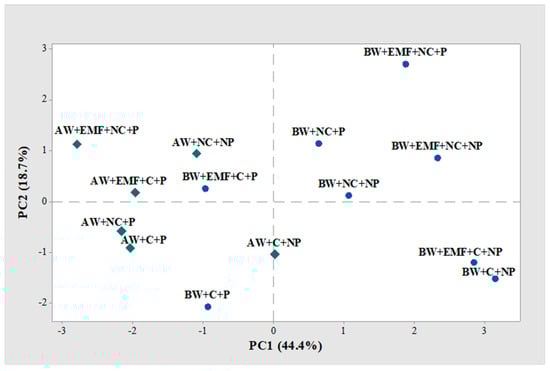 Principal Component Analysis (PCA) Score Plot displaying the clustering of treatment groups based on the multivariate impact of EMF treatment and compost incorporation on soil ion dynamics. Each point represents a treatment combination, with brackish water (BW) and agricultural water (AW) treatments distinguished by color.
