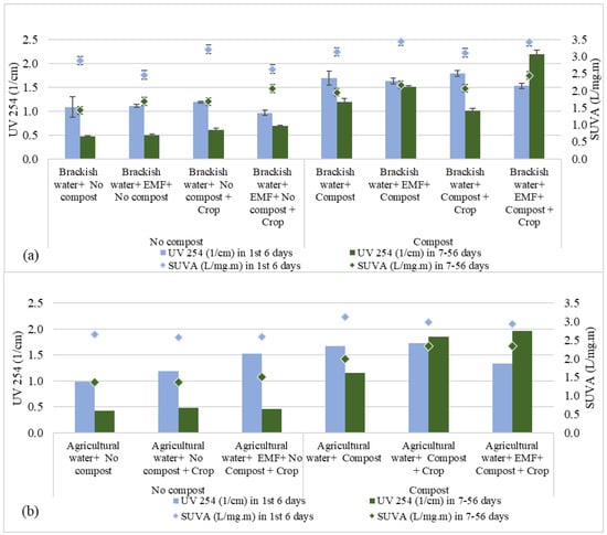 The analysis of organics for all 14 treatment combinations with varying plant, soil, and water treatment is illustrated in Figure 3. The UV254 and SUVA were higher during the first 6 days of irrigation than the values during the 7–56th days of irrigation after planting, indicating natural organic matter in water. In addition, the values were higher for compost-treated columns irrespective of the irrigation water types throughout the study period, indicating the higher amount of natural organic matter in soil. Compost treatment showed SUVA values ranging between 2.0 and 4.0, indicating the mixture of aquatic humic and non-humic matter; and a mixture of low to high molecular-weight substances found in compost (Figure 3b). This was also observed in the studies by Duong (2013) [51] and Staff (2011) [52]. The SUVA values decreased to less than 2, which shows a high fraction of non-humic matter in leached water after 56 days of irrigation for non-compost columns for both brackish and agricultural water irrigation with and without EMF treatment.