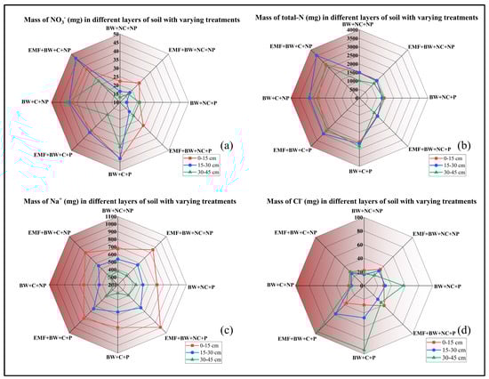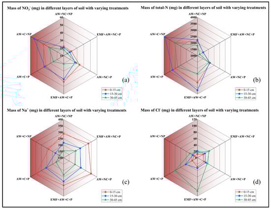 Mass of (a) NO3−, (b) total−N, (c) Na+, and (d) Cl− in soil layers at the end of the experiment for brackish water irrigation with and without EMF treatment.
