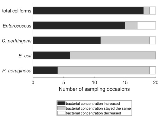 Frequency at which measured bacterial concentration increased, decreased, or stayed the same between water source and household storage. A total of 10 households and their corresponding water sources were each sampled twice, for a total of 20 pairs of concentrations (i.e., 20 overall sampling occasions). For each of the 20 sample pairs, bacterial concentration was considered to increase if the measured level of the indicator was higher in the household water than in the source water by at least 1 CFU/(100 mL) and was considered to decrease if the measured level of the indicator was lower in the household water than in the source water by at least 1 CFU/(100 mL).