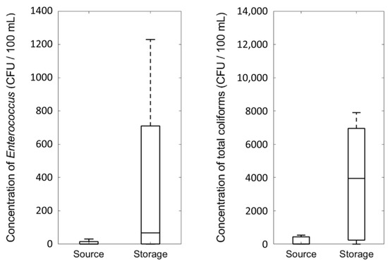 From Figure 2, it can be clearly seen that the bacterial concentrations increased between the water source and the household for both Enterococcus and total coliforms. Similar results were also observed for the other three indicators [45]. Based on a Mann–Whitney U test, the observed differences in bacterial concentrations were statistically significant for total coliforms (p = 0.0009), for Enterococcus (p = 0.011), and for C. perfringens (p = 0.0018). This finding is generally consistent with the results for frequency of regrowth/recontamination (Figure 1 and Section 3.1).