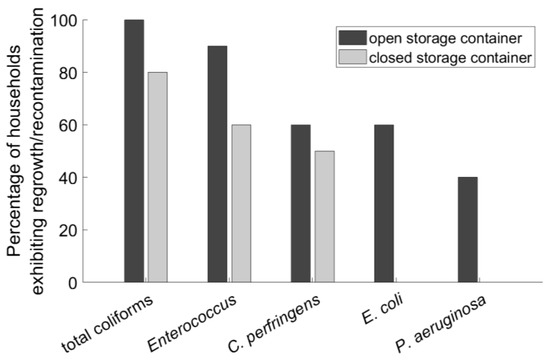 We therefore conclude that the use of closed storage containers does not, on its own, ensure protection against bacterial regrowth/recontamination. Closed containers do appear to offer protection against E. coli and P. aeruginosa, suggesting that perhaps these bacteria are introduced into the water by external sources such as animals or contaminated utensils. However, closed containers do not offer significant protection against Enterococcus, total coliforms, or C. perfringens. This might indicate that the presence of these bacteria in household water is caused by regrowth of the bacteria if they were present in the original source water, or that the household storage container itself is an important source of these bacteria, a hypothesis that will be investigated subsequently. However, these findings do not necessarily mean that closed storage containers might not be part of an overall strategy for safe water storage cf. [24,25]. In the sections that follow, we explore what other factors might be important and/or necessary towards an overall strategy of safe household water storage.