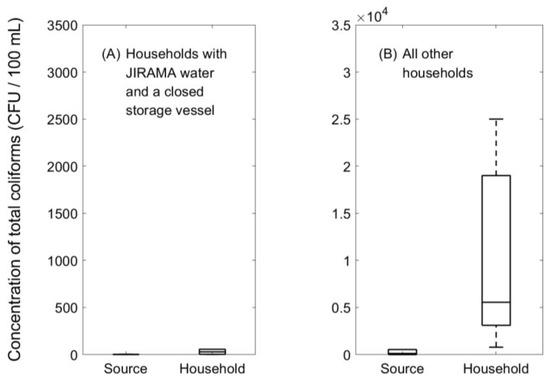 Three of the ten households considered in this study used both JIRAMA source water and a closed storage vessel [45]. These three households exhibited significantly less recontamination by total coliforms (p = 0.0034) and Enterococcus (p = 0.0083) than the other seven households (Mann–Whitney U test). This result is shown graphically in Figure 5 for total coliforms. For the other three indicators besides total coliforms and Enterococcus, recontamination was also less severe in the three households using JIRAMA water and closed vessels than in the other seven households. However, for those three indicators, the effect was not found to be significant with 95% confidence (Mann–Whitney U test, α = 0.05).