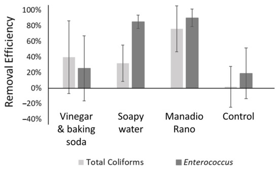 The efficacy of the cleaning methods is shown in Figure 6. All three cleaning methods provided some reduction in the average measured concentrations of Enterococcus and total coliforms, i.e., all three cleaning methods provided some benefit. Cleaning with Manadio Rano (dilute hypochlorite) provided significantly better reduction in total coliforms than rinsing with water alone (two-tailed t test, p = 0.031). Also, we can be 90% confident (but not 95% confident) that cleaning with either Manadio Rano or soapy water provides significantly better reduction in Enterococcus than rinsing with water alone (two-tailed t test, p = 0.051 and 0.064, respectively).