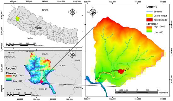 A large number of debris flows are commonly observed in the Suntar Formation of the Far-Western Development Region of Nepal. Kalli debris flows in Achham District are among the major recurring landslide-mobilized debris flows in this region. However, these landslides and debris flows in the Suntar Formation have not yet been extensively investigated. Interestingly, similar trends of repetitive occurrences of landslides and debris flows have been reported in some case studies conducted in other parts of Nepal as well as neighboring countries, which possess similar lithofacies to the Suntar Formation; these reported debris events include several incidents at Siddhababa along the Siddhartha Highway and at Jugedi Khola along the Narayanghat Muglin Road, as well as some events in the Dagshai Formation and in the Murre Formation of India and Pakistan, respectively [,,,,,]. However, these studies are mainly focused on the field conditions, influencing factors and potential triggering agents; there has been very little attempt at quantitative analysis or numerical modeling of debris flows in the region. In the present study, we aim to explore both field surveys and numerical simulations to study a typical landslide-mobilized debris flow, which recurs frequently during the rainfall seasons near Kalli village in this region.