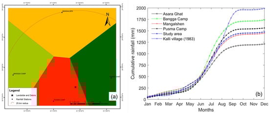(a) Thiessen polygon for the rainfall analysis. The arc indicates the distance of 25 km away from the Kalli landslide area (marked with star) and shows that all the rainfall gauge stations are within this 25 km range. (b) Average cumulative rainfall recorded at nearby weather stations and estimated for the study area.