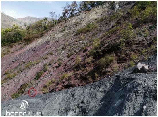 Geologically, the study area is dominated by the Lesser Himalayan rocks in the Far-Western Development Region of Nepal []. The most prominent rock formations in the study area are the Suntar Formation and the Swat Formation [], belonging to the Surkhet Group. The Swat Formation is mainly comprised of gray to dark gray, soft, carbonaceous shales with beds and lenses of fine-grained limestone, and the Suntar Formation consists of medium-grained, green-gray sandstones with purple shales [,]. The purple shale slope of the Suntar Formation is commonly exposed and visually evident in the study area (Figure 3).