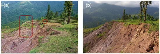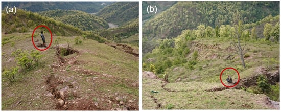 (a) The rampant tension cracks at the landslide. (b) Another view of the tension cracks that form separate mass blocks. The red circle in both images indicates the size of a visitor.