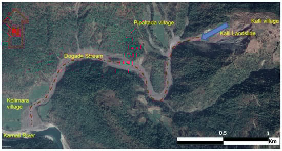 Kalli landslide, occurring at Kalli village, and the debris runout along the Dogade stream to the Karnali river. The blue arrow indicates the landslide mobilized from the crown area at Kalli village. The red line indicates potential debris flow path along the Dogade stream. The upstream portion of the Dogade stream from the Kalli landslide area cannot be noticed clearly as the channel is constricted; but the portion between the Kalli landslide and the Karnali river is evident due to the widened channel resulting from the debris flow. A very wide debris fan along with the Karnali river constriction at the confluence point of the Dogade stream and the Karnali river due to debris deposit can be clearly observed.