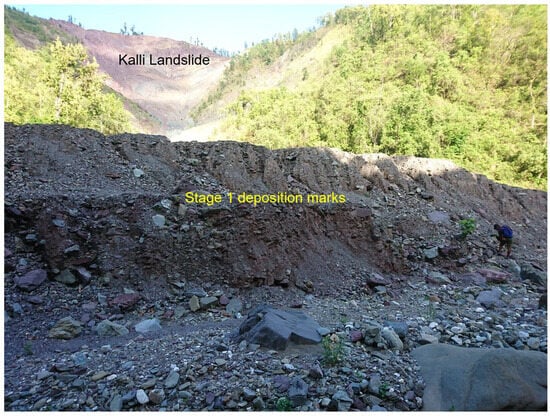Landslides and debris flows in the area are encountered almost every year during the heavy rainfall season. The landslides are predominantly made of solid material traveling at a moderately low velocity. A debris flow typically contains a significant fraction of water, whose presence facilitates the liquefaction of fine grains and renders the flow highly mobile [,]. The largest landslide and debris flows on record took place on the 12 September 1983. This event was so extreme that some of the debris material flowed over 3 km to reach Karnali river along the Dogade stream. It was initiated from fresh landslides, and then, grew significantly with the debris deposited nearby from earlier landslide events. The landslide and debris flow occurred during heavy rains. The rainfall recorded on that day at the Pusma Camp rainfall gauge station, located 9.67 km from the study area, was 230 mm; this strongly suggests that the landslide and debris flow were triggered by the heavy rainfall.