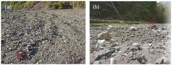 (a) Deposition of finer particles at 500 m from the landslide toe; the red circle on the left encloses a cell phone. (b) Deposition of coarser particles at 2500 m from the landslide toe; the circle on the right shows a visitor.