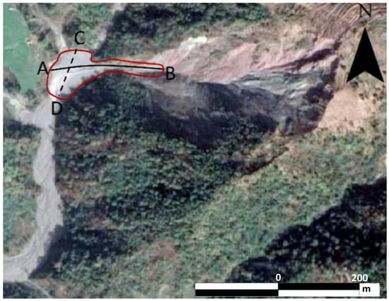Deposition area (marked in red) of debris material near Pipaltada village (Figure 5), accumulated during the first stage, as observed in the field. Deposition along the longitudinal direction, AB, and the transversal direction, CD, is examined in the subsequent simulation.