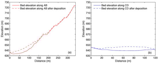 The deposition profile along the debris flow in the Dogade stream and along the Karnali riverbank is presented in Figure 16. In this stage, with a sufficient amount of water that mixes with fine particles such as clay, silt and fine sand, the debris behaves like a moderately high density solid–fluid mixture which can hold together large particles such as boulders and cobbles during the flow. It also lubricates the coarser particles and decreases the basal friction; therefore, the whole debris mass can flow relatively easily at a high velocity and travel over a long runout distance of over 3000 m, as shown in Figure 14. In such a case, the runout distance of solids (coarser particles) is longer than fine solid. Indeed, the deposition along the Dogade stream is not very significant as the debris tends to flow along the stream. As shown in Figure 16a, the elevation change in the Dogade stream is hardly appreciable when plotted, with the elevation height ranging from 400~900 m; hence, the deposition depth, i.e, the change between the elevations, is also plotted separately on the axis on the right side in Figure 16a. It shows that the deposition is less than 2 m along the Dogade stream, except at the end of the stream where the deposition depth grows considerably to about 4 m at the fan near Kolimara village; the results are supported by the field observation of the accumulation of a large amount of debris material in this area. The simulation also shows large deposition along the Karnali riverbank (Figure 16b) after a considerable amount of debris material continues its runout and reaches the Karnali river. This is also consistent with the field observation.