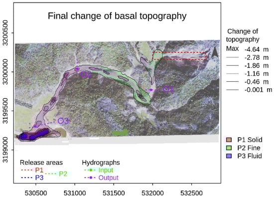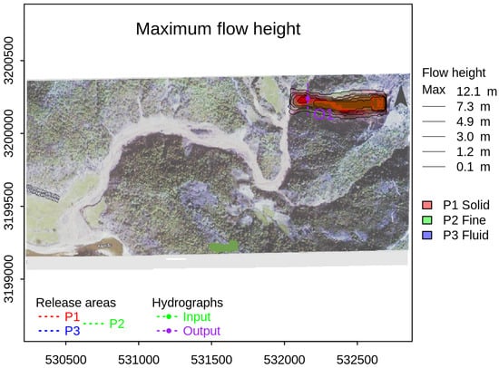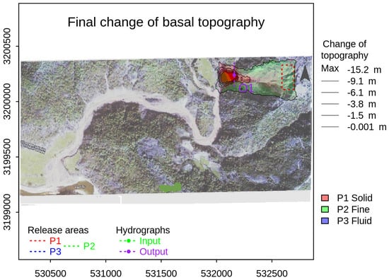 Figure 10 shows the detailed deposition results generated by the numerical simulation; they match very well with the field observation of the area of the deposited mass (Figure 9). The symbols P1, P2, and P3 in Figure 10 represent the solid, fine solid, and fluid phase, respectively; H and Q represent the flow height (depth) and the discharge, respectively. The area enclosed by the red dotted line is the release area (Figure 10). The deposition height is demonstrated by contours. The outermost contour represents the lowest deposition height and the innermost contour represents the highest deposition height. Each phase is represented by a different color, as indicated in Figure 10.