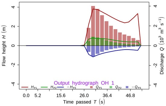 It is also of interest to examine the details of the debris flow around the area and at specific locations along its path. Figure 12 shows the overall the maximum flow height around the area. The debris is highly concentrated at the center and dominated by the solids fraction at the initiation. A point is selected and marked as O1 near the end of the deposition in Figure 12; it is located at the section 450 m from the landslide crown. Figure 13 shows the flow height of each phase and the discharge rate at this section. The debris material reaches this section at 26 s from the initial release time, and then, the maximum flow height and discharge occurs at 31 s. During this 5 s interval, the discharge rate has increased sharply, and then, decreased gradually after the peak discharge. The time from zero discharge to peak discharge is almost one-fifth of the time between peak discharge and zero again when the flow passes this section entirely. This shows that during debris flows most of the flowing mass is at the front.