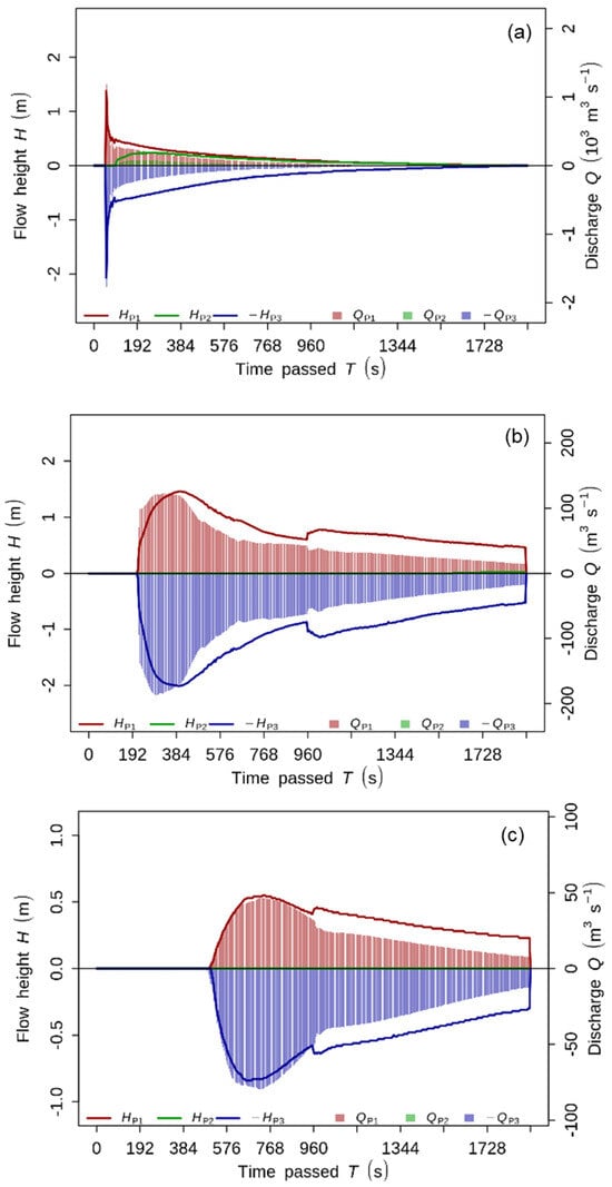 Hydrographs at (a) O1, (b) O2, and (c) O3 along the flow path.