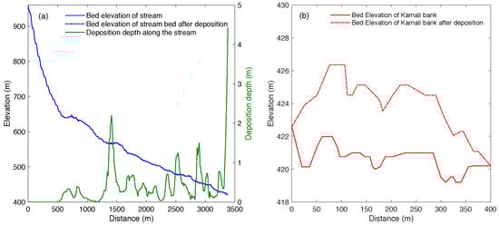 Deposition profile (a) in the Dogade stream, and (b) along the Karnali riverbank obtained from numerical simulation.