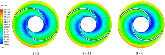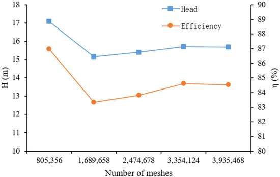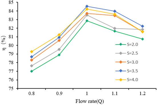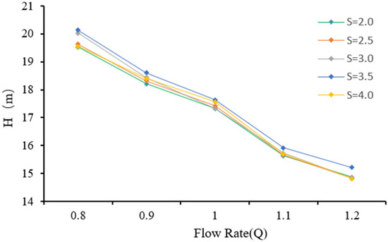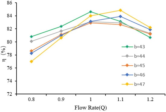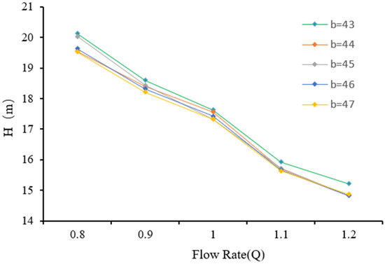 - In the authors’ opinion, in terms of blade thickness, under the small flow condition, the blade thickness can be increased appropriately to improve efficiency, and under the large flow condition, it is necessary to increase the blade thickness cautiously; 3.5 mm is optimal under this model. Increasing the blade thickness will increase the probability of casting defects and reduce the casting molding rate and impeller outlet width; increasing the impeller outlet width will lead to a decrease in head. At a small flow rate increase, the impeller outlet width efficiency will decline, and when the flow rate reaches the design flow rate above, the efficiency will rise. The author believes that increasing the impeller outlet width will lead to design point offset. Increasing the impeller outlet width leads to an increase in residual melt at the connection and a decrease in residual melt on the blade surface, and casting defects are likely to occur at the connection between the blade and the rear cover plate.