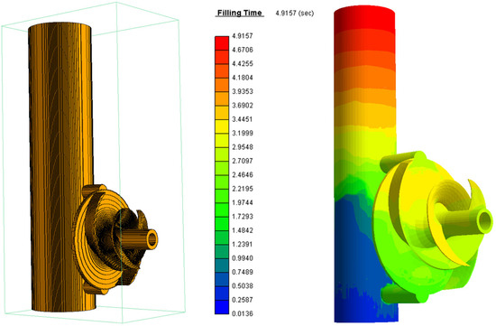 - Zhang, F.; Zhang, J.; Xi, L.; He, Z.; Wang, Y. Numerical simulation study of aluminium alloy impeller investment casting. Foundry Technol. 2016, 37, 805–808. [Google Scholar] [CrossRef]