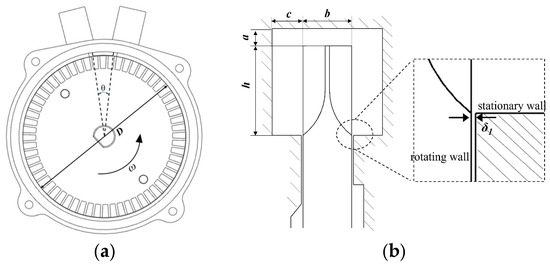 The structural parameters of the vortex pump are shown in Figure 1. The top clearance of the impeller (a) is 1.64 mm, the impeller width (b) is 4.10 mm, the single-side width of the flow passage (c) is 2.25 mm, the blade height (h) is 6.97 mm, the impeller diameter (D) is 84 mm, the tongue angle is 10°, the axial clearance (δ1) between the impeller and the tongue region is 0.20 mm, and the number of blades is 55. The rated operating condition is 10 L/min, and the rated speed is 4000 r/min.
