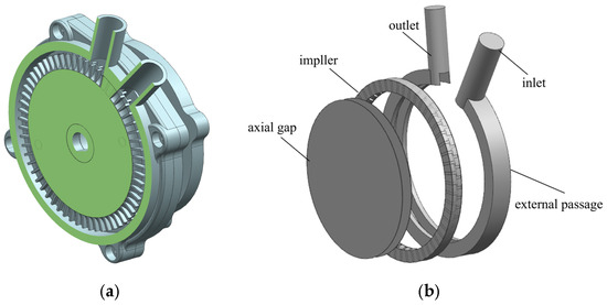 A 3D model was created using UG 10.0 software, as shown in Figure 2a. Key components such as the impeller, external flow passage, and the axial clearance of the vortex pump were extracted to form the computational domain, as illustrated in Figure 2b. To maintain the stability of the inlet and outlet flow parameters, the inlet length was extended to three times the pipe diameter, while the outlet length was extended to five times the pipe diameter. Furthermore, to enhance mesh quality, the axial clearance was separately meshed.