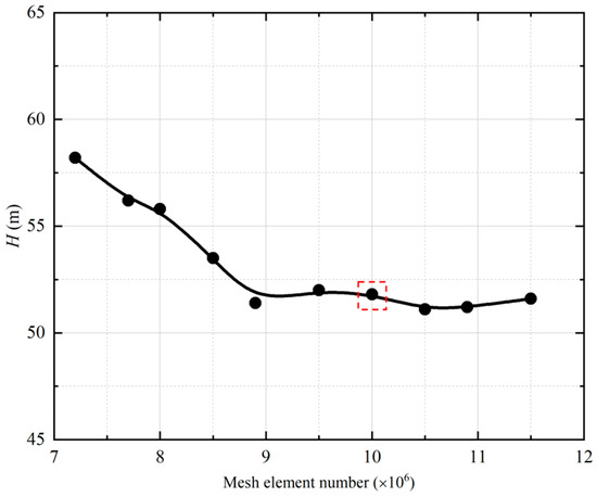 To reduce computational errors resulting from excessive grid refinement, grid independence verification was conducted under rated operating conditions. Figure 3 shows the variation in the pump head (H) obtained from calculations using the same settings but different grid sizes. From the analysis of the figure, it can be observed that when the number of grid cells increases to 10 million, as indicated in the figure, the calculated results for the pump head become essentially stable. Therefore, considering computational resources and time, the final total number of grid cells is determined to be approximately 10 million.