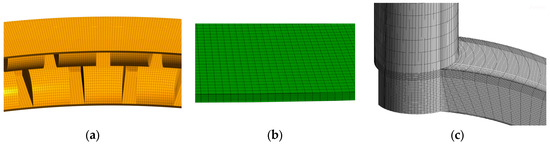 Computational domain meshing. (a) Impeller. (b) Axial clearance. (c) External passage.